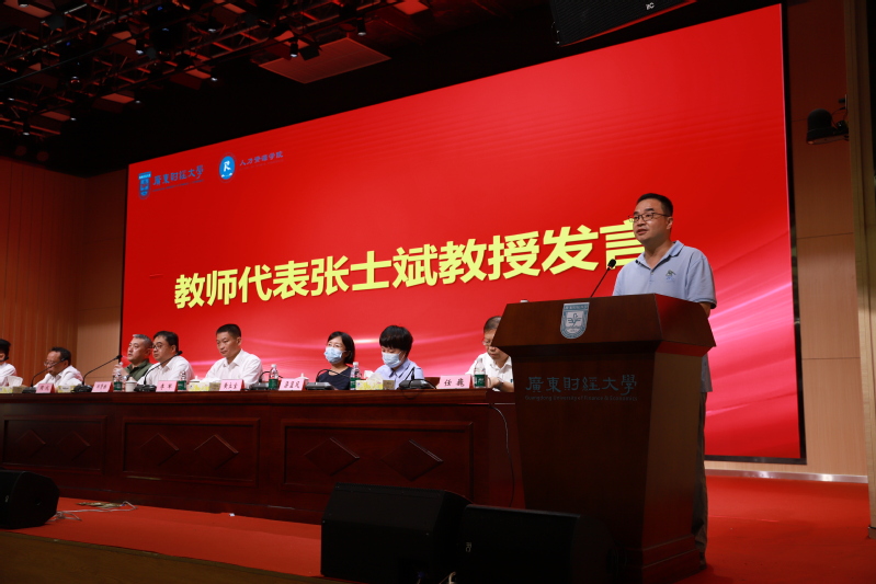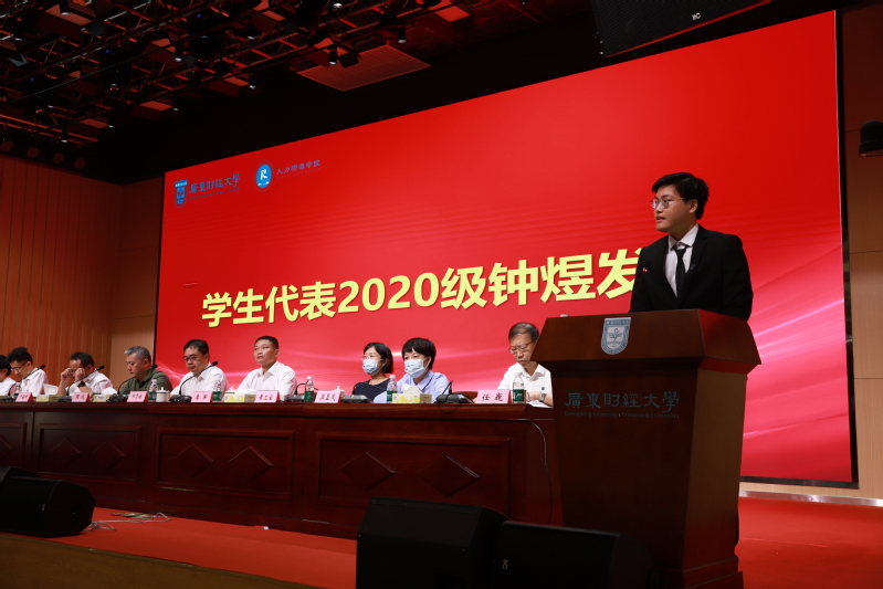 教师代表张士斌教授发言,向同学们提出了老员工活和学习实践的倡议,鼓励同学们勤于思考,勇于实践,拥有更贴地气的梦想与方向。2020级员工代表钟煜、2021级新生代表林依欣分别进行发言。