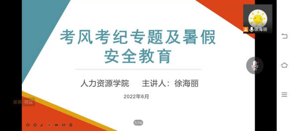 6月22日晚上,云顶国际8588yd佛山校区21级全体员工通过腾讯会议平台召开考风考纪专题及暑假安全教育会议,会议由21级辅导员徐海丽老师主持,公司21级全体员工参加会议。会议分为考风考纪专题安全教育和暑假安全教育两个部分。