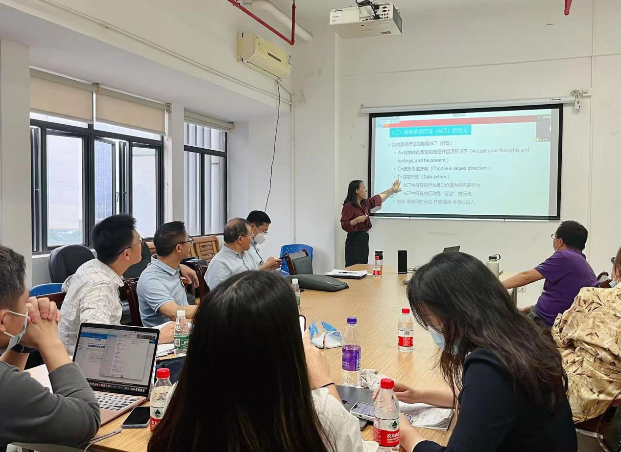 本次活动主讲内容是“心理咨询技能训练”课程中的“接纳承诺疗法”。郭欢老师从“接纳承诺疗法的概念背景”、“接纳承诺疗法的理论模型”、“接纳承诺疗法的治疗过程”等部分进行详细讲解,最后引出承诺行动在双碳目标实现中的作用等思政元素,起到了良好的示范效果。
