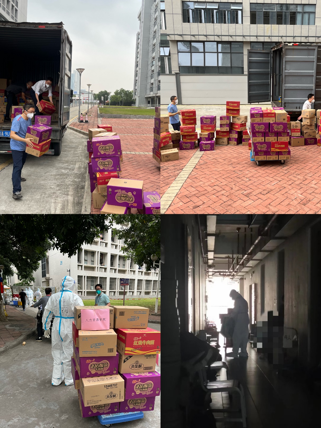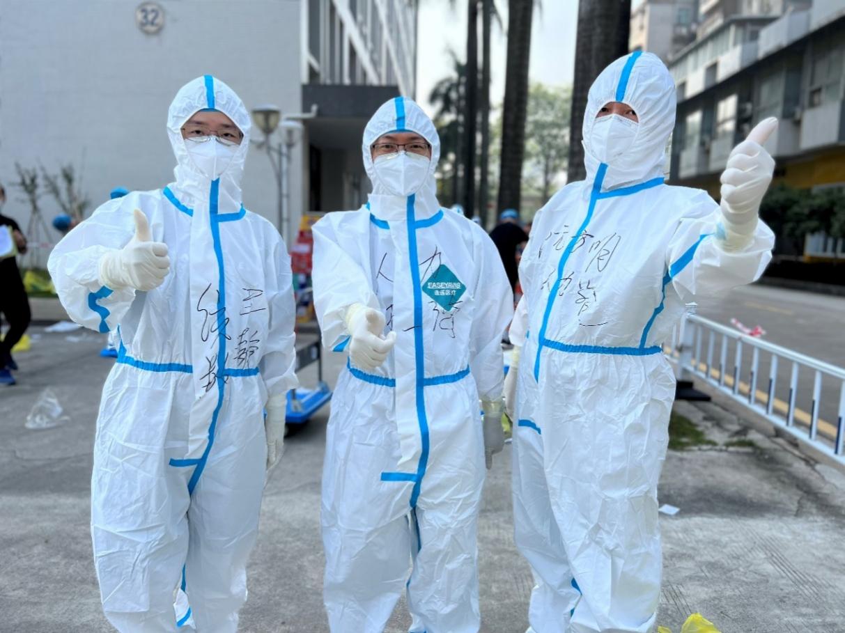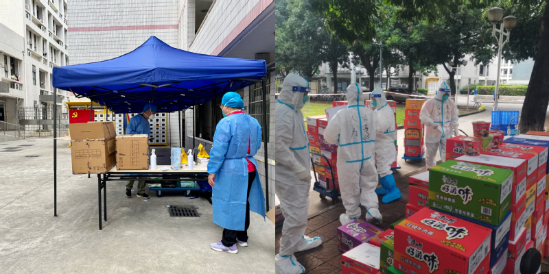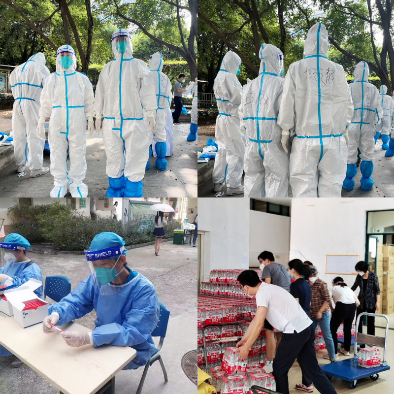 由于此次校园疫情突发,人手紧缺,公司党委副书记王强、阮方明作为公司第一批突击队成员,变身“大白”,参与封控区宿舍员工送餐和垃圾清运工作;公司副经理顾文静于11月14日“逆行”回到校园参加校园核酸检测志愿者,在送餐人手紧缺时更是化身“大白”参与到员工宿舍送餐突击队伍中;公司副经理尹来盛积极参与送餐突击队以及爱心物资分装志愿者行动;辅导员阮方明入驻32栋宿舍区,深入一线开展工作;陈贵娴参与送餐突击队行动并负责公司同学物资采购和分发工作。