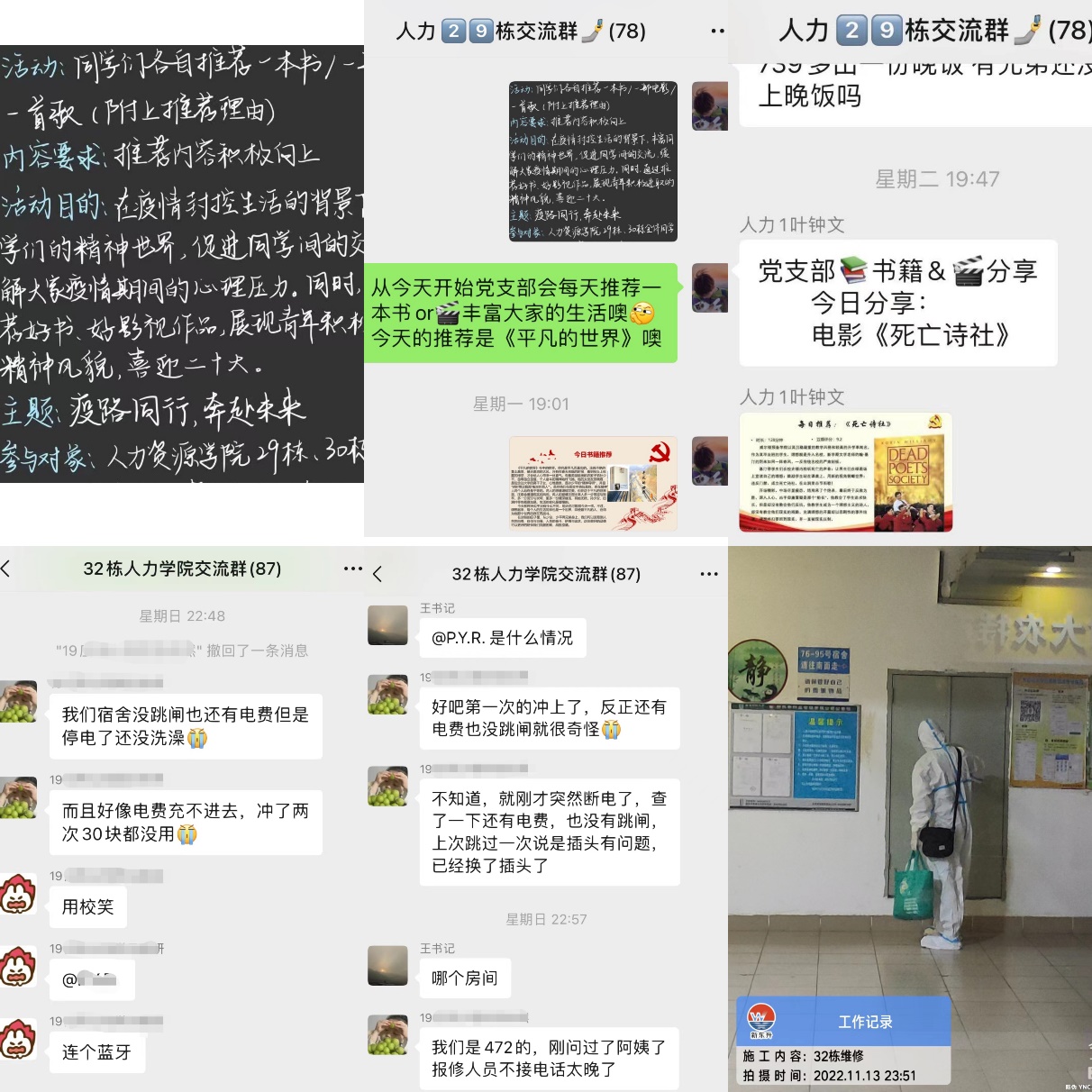 校园疫情发生后,各楼栋以员工党员为楼长,各班班长为班级联系人落实好各项校园疫情防控工作;同时,公司党委第一时间以楼栋为单位建立临时党支部,由学工书记、辅导员分别担任各临时党支部书记,临时党支部带头承担各栋防疫抗疫工作,组织策划员工党员学习活动和员工相关活动,例如书籍、电影推荐活动,学习打卡活动,应用心理学的高年级同学还发挥专业特长,为同学们进行心理疏导等,丰富员工宿舍生活。