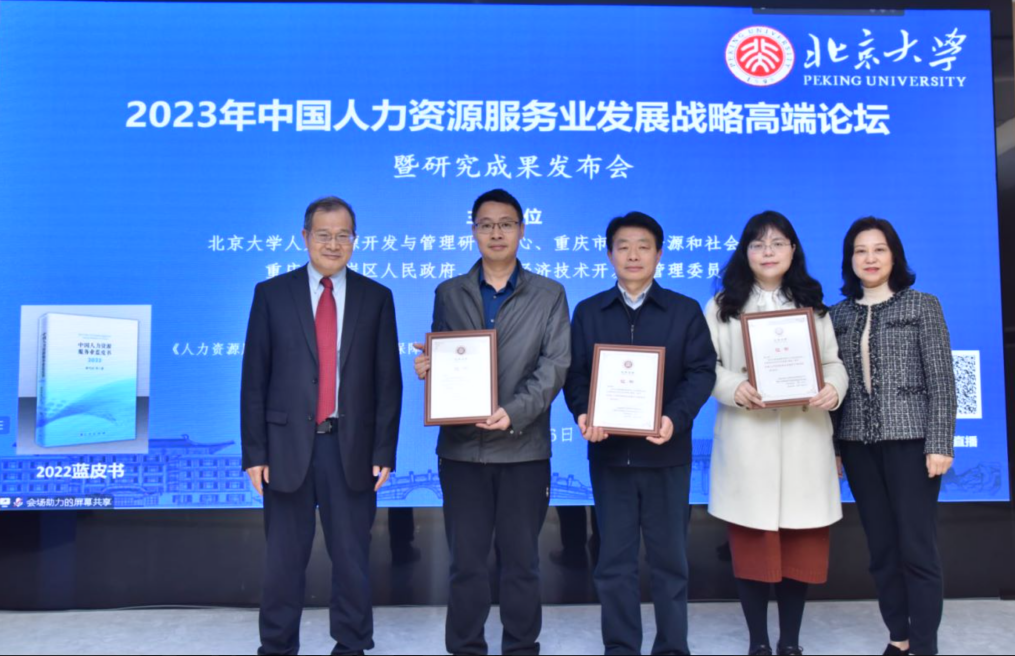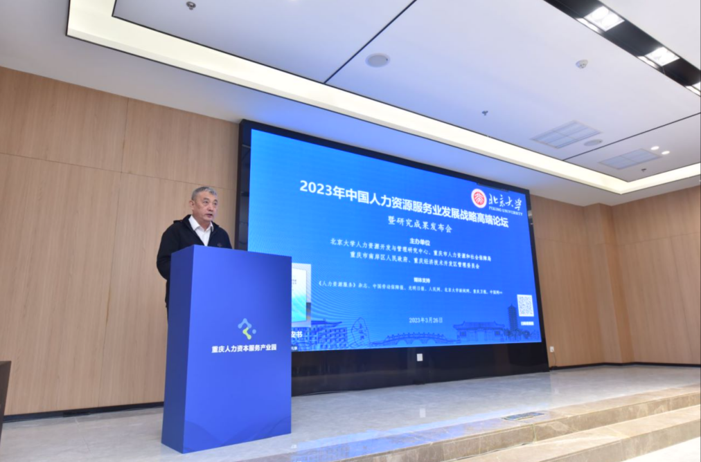 2023年3月26日上午,由北京大学人力资源开发与管理研究中心、重庆市人力资源和社会保障局、重庆市南岸区人民政府、重庆经济技术开发区管理委员会共同主办,北京大学政府管理公司与中国人力资源开发研究会人才测评专业委员会协办,重庆人才大市场集团有限公司、中共重庆市南岸区委宣传部、南岸区人力资源和社会保障局、重庆经济技术开发区创新创业服务中心承办的2023年中国人力资源服务业发展战略高端论坛暨研究成果发布会在重庆成功举办。中国网面向全国政企学产研相关观众进行了全程直播,人民网、光明日报、国家人社部《人力资源服务》杂志社、中国劳动保障报等媒体进行支持。