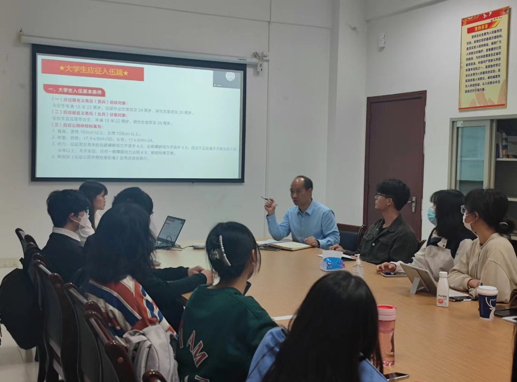黄东阳结合个人武装部工作经历及往年员工应征入伍的经验,从入伍基本条件、报名体检政审、注意事项、优惠政策以及毕业生入伍的发展优势等几方面为同学们进行了详细介绍。鼓励同学们积极响应国家的号召,把个人的理想追求和爱国情怀与新时代国防军队现代化建设目标紧紧结合在一起,到军营建功立业奉献青春力量,为祖国的国防事业作出应有的贡献。