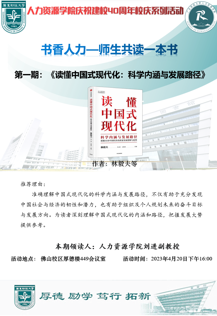 第一期活动将于4月20日下午16:00在佛山校区厚德楼449会议室举办,届时我们将邀请公司刘进副教授担任活动嘉宾,带领大家共读《读懂中国式现代化:科学内涵与发展路径》。