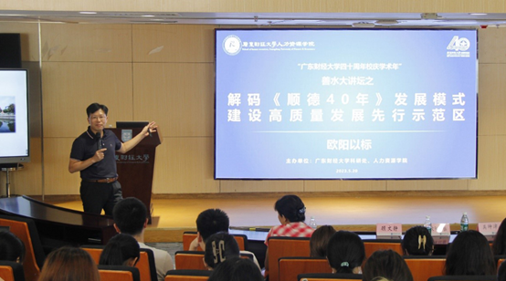 5月20日下午,2023年第3期(总第122期)“善水大讲坛”系列讲座在佛山校区同心楼101报告厅举行。广东顺德农商银行总行研究所副所长,暨南大学、华南理工大学与顺德农商银行共建国家级博士后科研工作站负责人欧阳以标博士作了题为“解码《顺德40年》发展模式,建设高质量发展先行示范区”的学术讲座。云顶国际8588yd副经理顾文静、吴坤津、辅导员徐海丽及员工100余人参与。讲座由吴坤津主持。