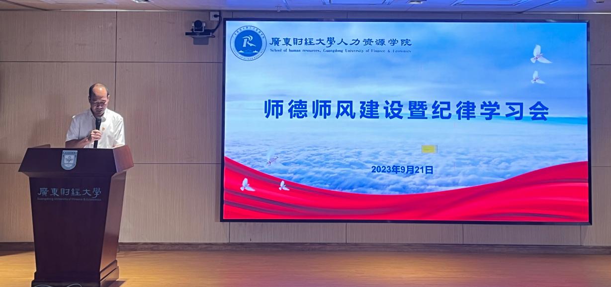 9月21日下午,云顶国际8588yd在佛山校区同心楼101学术报告厅召开了师德师风建设暨纪律教育学习会。经理萧鸣政、党委书记黄东阳、党委副书记阮方明、副经理尹来盛、吴坤津及全院教职员工出席。学习会由黄东阳主持。