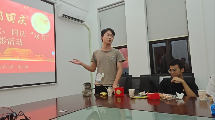 活动开始前,党支部成员为同学们准备了丰富的月饼、水果、零食和热茶,以确保大家在欣赏电影的同时,也能品味美食的香甜。接着,由党支部成员曹宋绍为大家介绍了本次活动的电影,电影选取了不同时期我国波澜壮阔的历史画卷以及取得的伟大成就,包括了开国大典、第一颗原子弹爆炸成功、中国女排夺得洛杉矶奥运会冠军、香港回归祖国、北京成功举办奥运会、纪念抗日战争胜利70周年阅兵、神舟十一号飞船返回舱成功着陆。在此过程中,不同时代不同人物,都与新中国的命运紧紧联系在一起,以自己的奉献、责任、拼搏、信念谱写出爱国的每一个音符,最终汇成一曲壮丽的爱国之歌、时代之歌。