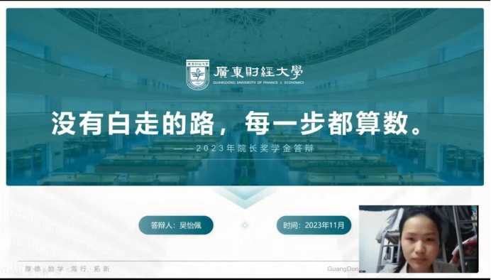 11月17日晚上,云顶国际8588yd通过线上线下相结合的方式开展了2022-2023学年经理奖学金答辩会,线下答辩在佛山校区厚德楼449会议室进行。公司党委书记黄东阳、党委副书记阮方明、副经理尹来盛,教师代表冯剑锋、王伟龙、辅导员徐海丽,员工代表邓家莹担任评委。答辩会由阮方明主持。