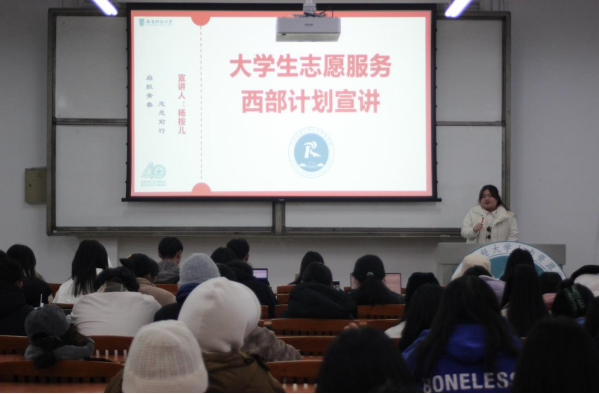 最后,社会实践部部长杨桉儿进行了老员工志愿服务西部计划宣讲,为同学们详细地介绍了西部计划的内容、选拔标准、参加西部计划的好处等内容,帮助大家更全面更深入地了解西部计划。青年学子奔赴西部,选择与时代同频共振,时不我待。杨桉儿呼吁大家积极加入西部计划志愿者的队伍,到西部去、到基层去,到祖国和人民最需要的地方去。