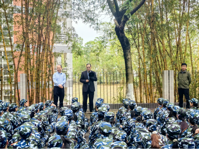 1月18日,为鼓舞军训士气,提高同学们的训练积极性,公司经理萧鸣政、党委书记黄东阳、党委副书记阮方明及辅导员徐海丽到军训场地慰问参加军训的2023级员工。