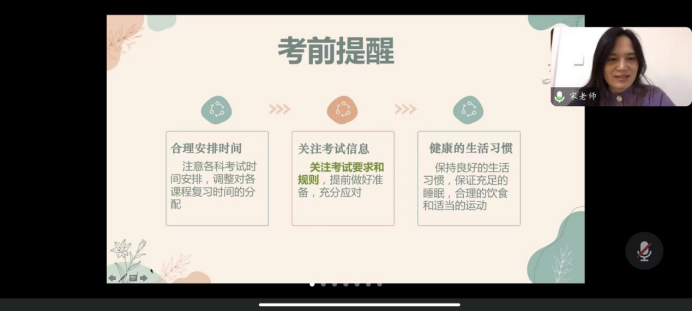 首先,敏慧老师向同学们简要介绍了期末考试的重要性和紧迫性。老师强调了期末考试对于我们学习成绩和学业发展的影响,提醒同学们要认真备考,合理安排时间,做好复习计划。敏慧老师传授同学们亲身经验,建议大家用任务清单法有条理地安排每一件事情,并鼓励同学们保持积极的心态去应对期末。