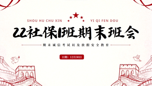 12月25日劳动与社会保障1班开展了期末动员、安全教育和期末心理疏导教育主题班会。通过这次班会,同学们对即将到来的期末考试有了更深入的了解,同时也提高了对安全意识的重视,并得到了一定的心理疏导。