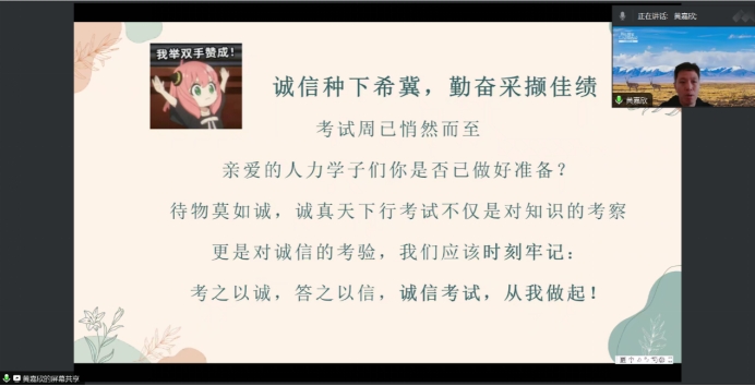 2021级人力资源管理2班于12月26日晚,通过腾讯会议开展了“期末总动员”。本次主题班会由班主任宋一晓老师主持,班级全体同学参与。