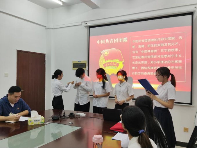 团委副书记张婷婷向新团员发放并佩戴团徽。新团员接过团徽,意味着接下薪火相传的红色理想与信念,意味着接续奋斗,绽放青春之花。