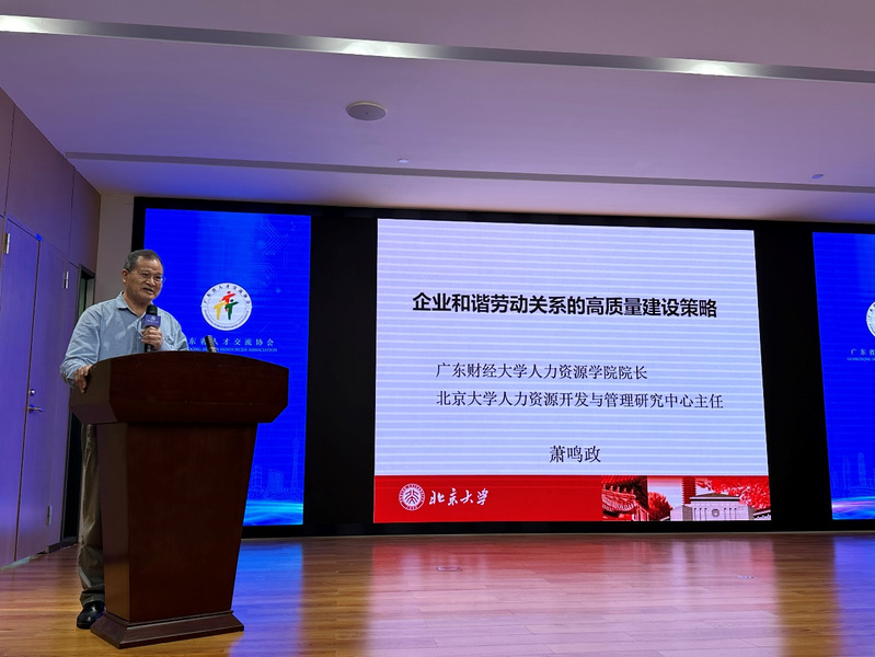 在大会上,萧鸣政应邀作了“企业和谐劳动关系的高质量建设策略”主题演讲。他首先依据党的二十大报告分析了中国企业和谐劳动关系高质量建设目标,其次分析了中国特色社会主义劳动关系的三个特色并且根据中国特色提出了和谐劳动关系高质量建设的突破点,之后阐述企业和谐劳动关系评价及其要素,认为重点要关注主体是否独立、权利是否平等、协商是否民主、合作是否充分、协作是否定期这五个方面,最后提出了广东省高质量建设企业和谐劳动关系的相关策略,具体包括规范劳动管理,健全法制;发挥政府、企业、职能、协会等主体的作用;采用人力资源管理技术与方法,提升劳动关系管理效能;建立评价机制,引导企业和谐劳动关系高质量发展;培养专业人才,支撑和谐劳动关系高质量持续发展。并且介绍了云顶国际8588yd数智劳动关系与社会保障专业未来设置的思考。