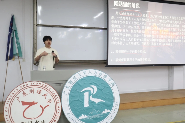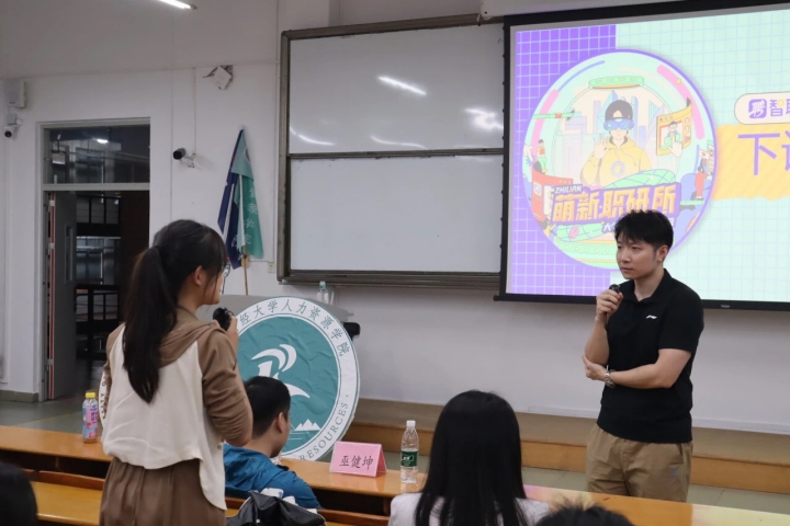 接着,吴俊杰同学为大家进行了应聘者赛道经验分享。他用幽默风趣的口吻,深入浅出地为同学们讲述了如何去挖掘自己的角色、跳出逻辑陷阱、发散创新思维。吴同学指出“我是什么就做什么”,我们在团队里应该担任适合自己的角色,这样才能有效提高团队核心竞争力。此外他还分享了一些撰写简历、无领导小组讨论和面试的经验,为同学们带来满满干货。