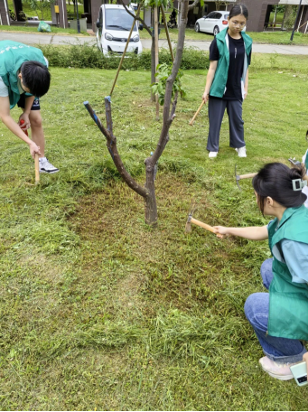 在护苗阿姨的耐心讲解和教学下,社实成员积极参与实践,用心且小心地投入除杂草守护树苗行动中。