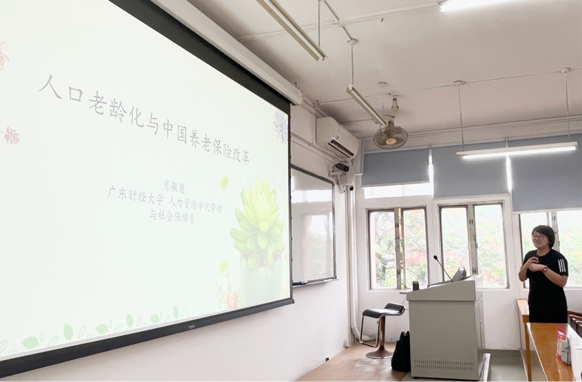 6月4日下午,公司劳动与社会保障系肖敏慧博士在佛山校区励学楼302,为公司师生开展主题为“人口老龄化与中国养老保险改革”的学术讲座。副经理吴坤津、劳动与社会保障系副主任冯剑锋,以及公司师生30余人参加讲座。