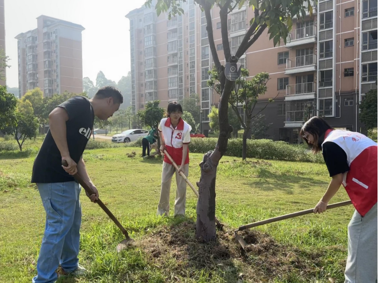活动当天,员工志愿者团队分成两个小组。在护苗活动中,巫健坤带领志愿者来到劳动教育实践基地。员工党员积极发挥先锋模范作用,带领着志愿者们手持工具,拿起锄头,认真细致地为树苗松土除草。大家分工协助,相互配合。经过大家的共同努力,杂草丛生的草坪重新焕发出了盎然生机。