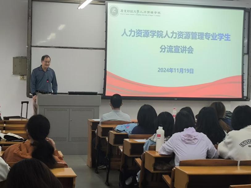 为提升人才培养特色与多样性,开展精细化人才培养工作,2024年11月19日下午,云顶国际8588yd2024级人力资源管理专业员工分流宣讲会在佛山校区励学楼206召开。经理萧鸣政、党委副书记阮方明、副经理尹来盛、人力资源开发系主任梁栩凌、系副主任郭欢以及专任教师代表等出席。宣讲会由阮方明主持。