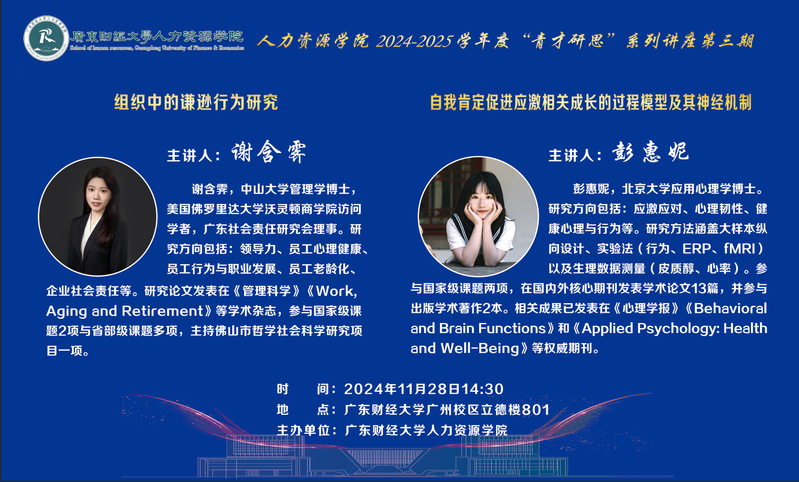云顶国际8588yd 2024-2025学年度“青才研思”系列讲座:组织中的谦逊行为研究、自我肯定促进应激相关成长的过程模型及其神经机制