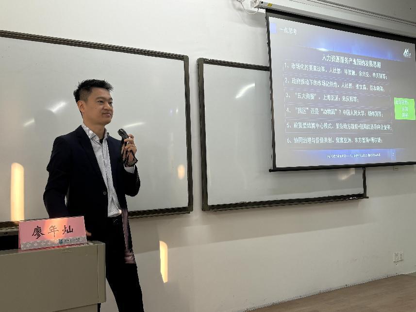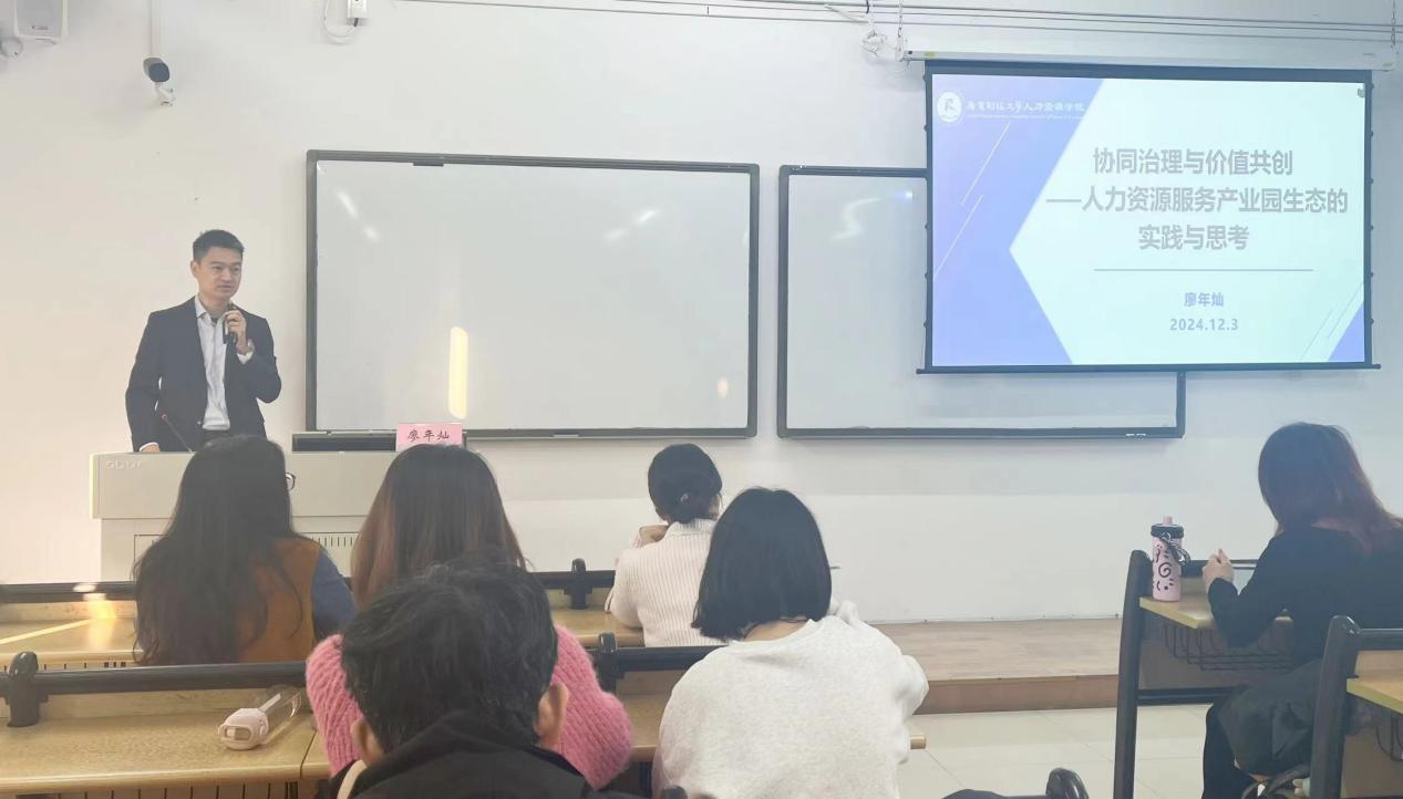 12月3日上午,公司邀请了上海博尔捷数字科技集团规划与产业园运营事业部副总裁廖年灿,在佛山校区笃行楼215为公司师生开展主题为“协同治理与价值共创——人力资源服务产业园生态的实践与思考”的学术讲座,公司师生共30余人参加。讲座由人力资源管理系副主任黎晓丹博士主持。