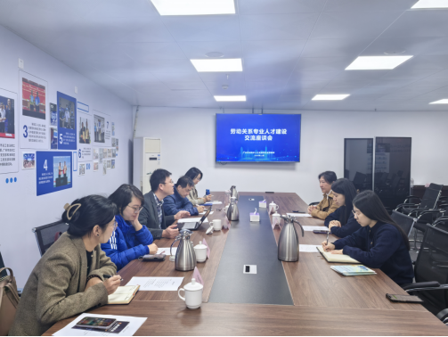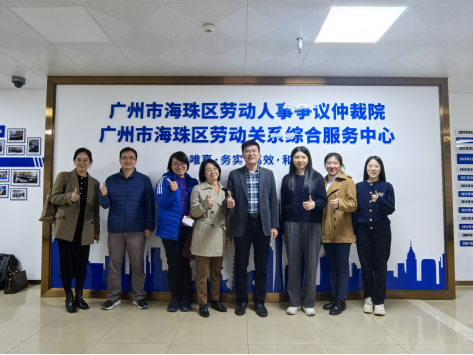 调研组一行首先参观了海珠区数智就业驿站、海珠区劳动人事争议仲裁庭等场地,双方围绕海珠区和谐劳动关系试点建设情况,劳动关系人才需求与供给,劳动关系人才培养和课程建设,员工实习和实践基地建设,劳动关系服务驿站建设与公益课堂开设等方面进行了深入交流,达成了诸多合作共识。接下来,双方将进一步深化合作细节,稳步推进各项合作事宜。