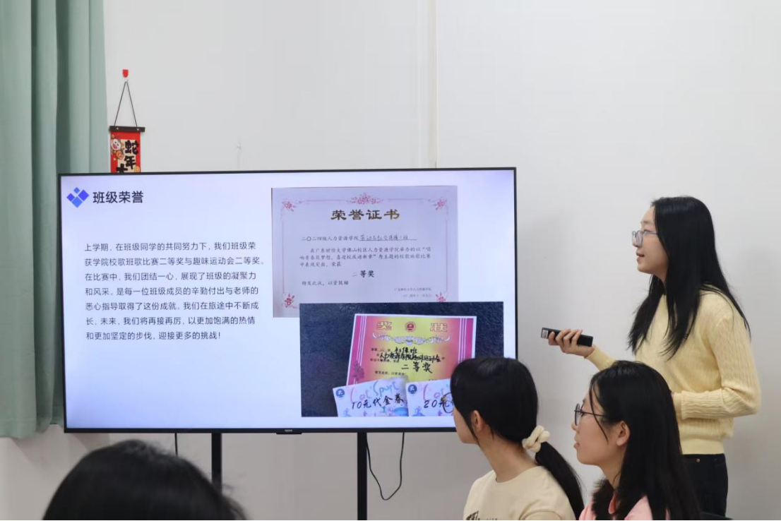 “人才为基,管理为翼,开发进取,所向披靡”:最后2024级人力资源管理(人才开发与管理方向)一班亮相。他们通过展示分享班级符号含义,尽显同学情谊,表达对未来的期待 。