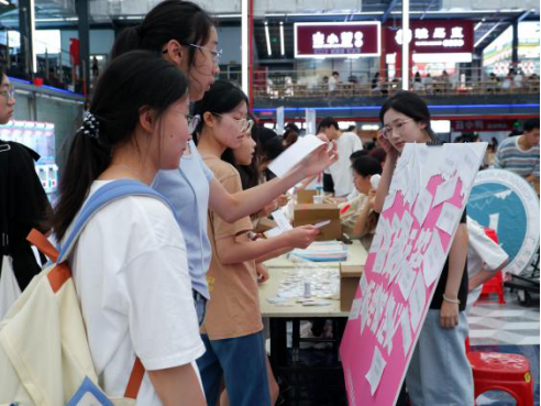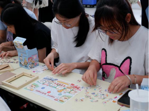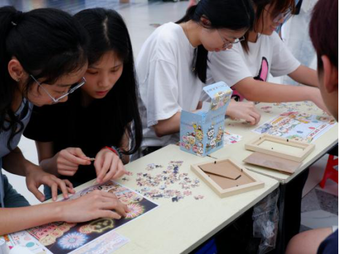 而诗韵新篇”环节为活动增添了文艺气息。同学们用贴纸贴出诗句,当作对自我、他人或未来的期许。一句句诗句,既是对自己的鼓励,也是情绪宣泄的突破口。拼图区里,同学们自由组队,在协作下完成一幅幅拼图。每一块拼图都独一无二,正如每个人都有自己的闪光点;而将零散的拼图拼接成完整的图片的过程,也恰似人与人之间相互理解、彼此包容的美好联结。