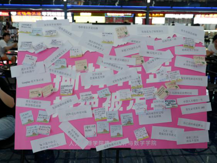 活动伊始,“撕标签”环节迅速吸引了同学们的参与,大家都将目光聚焦于展板上。展板上贴满了诸如“生活就得将就着过”“考研考公才是出路”等象征社会偏见的负面标签。同学们勇敢撕下这些束缚自我的话语,取而代之的是在便签上写下反驳与鼓励:“前途似锦,来日方长”“不用在意别人的看法,做自己就好”。这一撕一贴之间,不仅让心理压力得到释放,更让大家意识到:撕掉外界强加的标签,才能真正拥抱幸福人生。